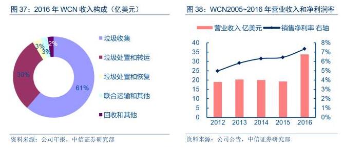 從收入規(guī)???,廢物聯(lián)合公司(WCN)是北美第三大固體廢物服務(wù)公司,也是北美領(lǐng)先的油田廢物處理公司,在美國和加拿大提供垃圾收集、轉(zhuǎn)運、處置和回收服務(wù)。截至2016年末,公司經(jīng)營261個固體廢物收集操作網(wǎng)絡(luò),135個轉(zhuǎn)運站,7個聯(lián)運設(shè)施,71個回收中心,93個垃圾填埋場,22個E&P液體廢物注入井和17個E&P廢物處理和采油設(shè)施??蛻艉w美國40個州和加拿大5個省份的住宅、商業(yè)、工業(yè)和E&P客戶。2016年公司實現(xiàn)營業(yè)收入33.76億美元,凈利潤2.47億美元。