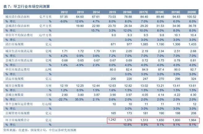 我們假設(shè)城市清掃面積增速在2015年基礎(chǔ)上穩(wěn)步小幅回落,而縣城清掃業(yè)務(wù)隨著機械化率提升而維持在較高增速;同時我們假設(shè)城市垃圾清運量未來維持在7%左右的增速,而縣城垃圾清運量維持在4%增速;