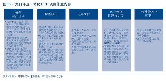 在國家及地方一系列環(huán)衛(wèi)市場化政策推動下,環(huán)衛(wèi)服務(wù)業(yè)市場化項目規(guī)模迅速擴大。目前已有許多以PPP模式運營的環(huán)衛(wèi)項目完成招標(biāo)。在招標(biāo)時,一種模式為環(huán)衛(wèi)一體化的整體處理項目,包含道路清掃、垃圾清運、公廁維護等分項的項目;除上述模式外,將環(huán)衛(wèi)與后端垃圾焚燒發(fā)電、餐廚及污泥處置等項目綜合打包也開始變得頻繁起來。其中??诃h(huán)衛(wèi)一體化PPP項目以及固原市循環(huán)經(jīng)濟產(chǎn)業(yè)園及環(huán)衛(wèi)一體化項目分別為上述模式的典型案例。