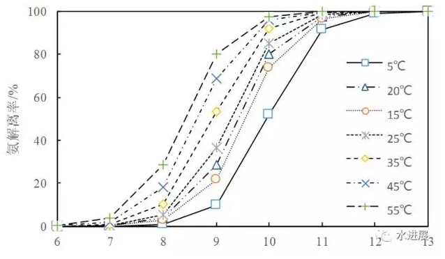 根據(jù)計算(過程見原文,此處省),當(dāng)pH≥11、液體溫度雖為5 ℃時,氨解離率達(dá)92%;但當(dāng)pH=7時,即使溫度上升至55 ℃,其解離率也僅為3.9%。所以,pH對氨氮吹效率影響最大,次要影響因素還有溫度、氣水比、氨氮濃度等。