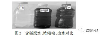 7.2 試驗(yàn)結(jié)果分析:根據(jù)中試運(yùn)行結(jié)果可知,72h 連續(xù)運(yùn)行測定的COD值分別為152mg/L、106.5mg/L、152mg/L,遠(yuǎn)小于設(shè)計(jì)值600mg/L。處理程度較深,水中大部分有機(jī)物都得到了降解,工藝處理能力大大超過設(shè)計(jì)要求,中試裝置試驗(yàn)結(jié)果也驗(yàn)證了本含堿廢水處理工藝的成功。處理后與處理前水樣對比見圖2(左:出水、中:濃縮液、右:原水)。