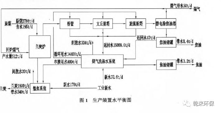 由圖1可知,60萬t/a蘭炭生產(chǎn)裝置是無盈水系統(tǒng)。系統(tǒng)中耗散水量比較大,一部分是蒸發(fā)、飛散等原因而耗散,另一部分是熄焦后由蘭炭吸附而耗散。這部分中蘭炭吸附耗散水來自煤氣洗滌水系統(tǒng)(即串接用水,煤氣洗滌水系統(tǒng)中部分被熄焦系統(tǒng)利用的水),含有大量煤焦油、酚、氨類等物質(zhì),在蘭炭生產(chǎn)區(qū),運(yùn)輸區(qū)及使用地區(qū)分別造成不同程度的污染。因此,這部分串接用水急需經(jīng)濟(jì)、環(huán)保的工藝進(jìn)行處理。蘭炭生產(chǎn)廢水分析指標(biāo):COD 40000-50000 mg/L;石油類2000--3500 mg/L;NH3-N 2000,-,4000mg/L;揮發(fā)酚2000-4000 mg/L;總酚8000--14000 mg/L;懸浮物1000 mg/L;硫化物200 mg/L;氰化物10mg/L;pH6--9。