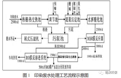 通過(guò)應(yīng)用“混凝反應(yīng)+水解酸化+MBR(膜生物反應(yīng)器)”處理工藝,并采用“臭氧催化氧化吸附 + RO 膜(反 滲透)””對(duì)出水進(jìn)行再生。具體工藝流程如下圖所示。