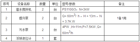 設(shè)計(jì)調(diào)節(jié)池1座,水力停留時(shí)間22h ,尺寸為25m×10m×6.0m ,有效水深5.5m ,鋼混結(jié)構(gòu)。池內(nèi)主要設(shè)備如下表。