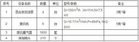 設(shè)計(jì)A /O 池二座,尺寸為39.0m ×18.0m×6m ,在長(zhǎng)度方向上分為4個(gè)串聯(lián)的廊道,每個(gè)廊道寬5m ,有效水深為5m 。前兩個(gè)廊道為A 段,每段設(shè)置潛水推進(jìn)器一臺(tái),并設(shè)置微孔曝氣器以增強(qiáng)對(duì)廢水的攪拌,防止大量污泥沉積。后兩個(gè)廊道為O 段,通過(guò)鼓風(fēng)機(jī)和微孔曝氣器向池內(nèi)供氧。A 段主要設(shè)備:潛水推進(jìn)器:4臺(tái);微孔曝氣器1000個(gè)。O 池采用鼓風(fēng)微孔曝氣。為抑制曝氣池中泡沫的產(chǎn)生,沿曝氣池隔墻表面布設(shè)有消泡水管。O 段主要設(shè)備如下表。