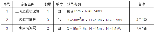中心進(jìn)水的輻流式沉淀池一座,二沉池直徑16m ,總高4.4m ,超高0.5m ,鋼筋混凝土結(jié)構(gòu)。內(nèi)設(shè)刮吸泥機(jī)1臺(tái),功率1.87kW 。二沉池的底泥通過(guò)刮吸泥機(jī)進(jìn)入集泥井,集泥井尺寸為4.5m×3.0m×5.9m。主要設(shè)備如下表。