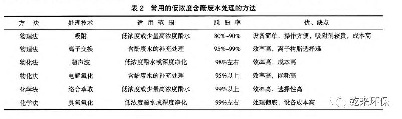 5.1物化預(yù)處理:根據(jù)工程經(jīng)驗(yàn),經(jīng)過生化法處理的廢水含酚量應(yīng)該低于300 mg/l。且水中不得含有氨、焦油或油類物質(zhì),否則就會(huì)抑制微生物的生長(zhǎng),影響對(duì)污染物的分解,甚至造成微生物的中毒死亡,降低廢水的處理效果。廢水中的酚類和油類物質(zhì)同屬有機(jī)物,具有“相似相容”的性質(zhì),而酚還屬于Lewis酸,易與極性水分子之間形成氫鍵,增加其在水中的溶解度,進(jìn)而促進(jìn)油水的惡性乳化。因此,對(duì)酚類和油類物質(zhì)的去除過程存在嚴(yán)重的相互干擾,需要通過分步交替處理以便使廢水中的污染物達(dá)到可生化處理要求。(1)脫酚工業(yè)生產(chǎn)中,酚濃度為1 000 mg/l以上的廢水稱為高濃度含酚廢水,回收利用其中的酚類物質(zhì)可增加廢水處理的經(jīng)濟(jì)效益。目前,工業(yè)上常用來處理高濃度含酚廢水的方法主要集中在物理分離方法,如:蒸汽吹脫除酚、溶劑萃取脫酚等。結(jié)合本文煤焦油加氫主體裝置的操作特點(diǎn),在處理煤焦油加氫廢水時(shí)可優(yōu)先采用溶劑萃取方法脫酚,且為降低萃取劑的分離成本,所選用的溶劑應(yīng)盡量從煤焦油分餾系統(tǒng)或煤焦油加氫系統(tǒng)的中間產(chǎn)物或產(chǎn)品中選取。經(jīng)模擬計(jì)算,本文中煤焦油加氫裝置廢水中的酚可由20 000降低到1 500mg/1以下。在工程實(shí)踐中,可用于進(jìn)行低濃度含酚廢水處理的方法較多(見表2),需結(jié)合主體裝置的操作特點(diǎn),選擇操作方便、投資成本和運(yùn)行費(fèi)用低的脫酚技術(shù)。