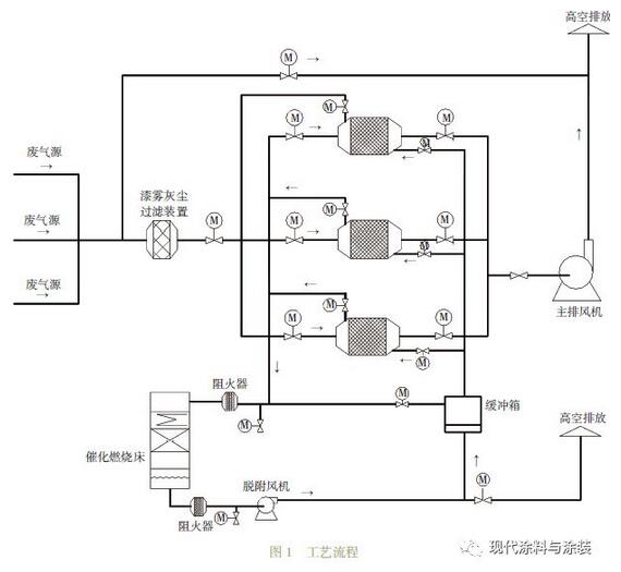 本著安全、節(jié)能、方便、可靠、經(jīng)濟(jì)的原則,預(yù)防廢氣中含有少量粉塵顆粒。首先有機(jī)廢氣經(jīng)組合干式過濾器,去除廢氣中的漆霧粉塵及顆粒物,以防活性碳微孔被堵塞,延長活性炭的使用周期,然后將符合吸附條件的有機(jī)廢氣送入活性炭吸附箱進(jìn)行吸附凈化,凈化后的潔凈氣體由主排風(fēng)機(jī)排入大氣中。吸附裝置配有備用吸附箱1套,當(dāng)活性炭吸附飽和后通過控制閥門切換至催化燃燒脫附狀態(tài);脫附再生系統(tǒng)采用在線脫附再生,即吸附過程為連續(xù)式處理工藝,在備用吸附裝置投入使用同時(shí),飽和吸附箱則進(jìn)行脫附工作,脫附后活性炭箱預(yù)備至下次循環(huán)使用。