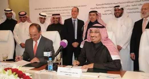 這座在建中的海水淡化廠被稱為全球首座大規(guī)模的太陽能發(fā)電海水淡化廠。該項(xiàng)目于2015年立項(xiàng),由沙特AWT公司(Advanced Water Technology, AWT)與西班牙可再生能源集團(tuán)公司Abengoa聯(lián)合開發(fā),投資1.3億美元,在2017年底完工。該廠第一期的日處理能力為60000m3/天,能夠滿足15萬人的用水需求,并計(jì)劃在第二期新增90000m3/天的處理量。AWT是沙特阿拉伯王國阿卜杜拉阿齊茲國王科技城(King Abdulaziz City for Science and Technology ,簡稱KACST)的商業(yè)分公司,由沙特技術(shù)開發(fā)和投資公司Taqnia控股。
