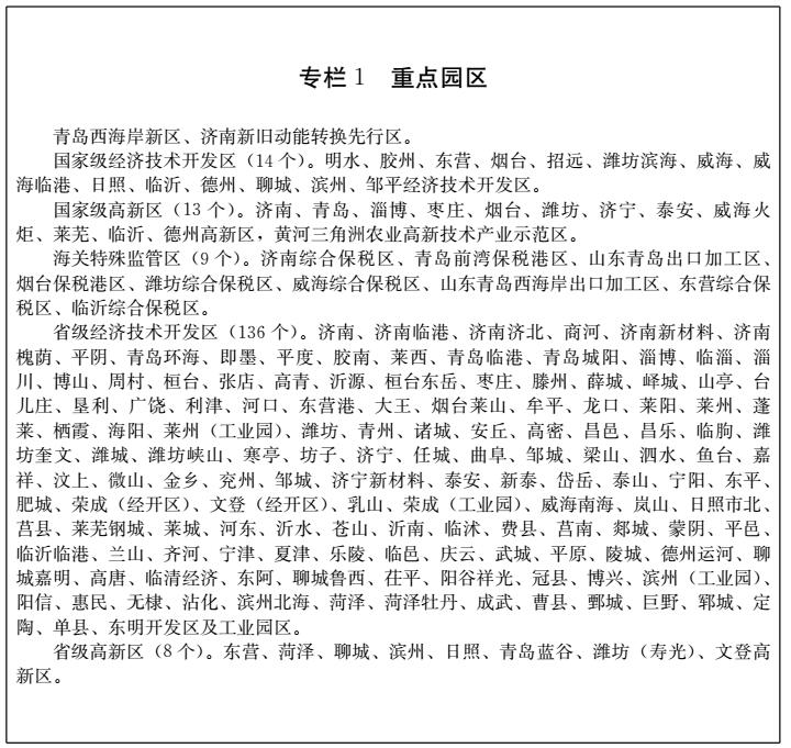 以淄博等14市國家和省級經(jīng)濟(jì)技術(shù)開發(fā)區(qū)、高新技術(shù)產(chǎn)業(yè)開發(fā)區(qū)以及海關(guān)特殊監(jiān)管區(qū)等為重點,創(chuàng)新園區(qū)管理運(yùn)營機(jī)制,明確各市產(chǎn)業(yè)發(fā)展方向,培育特色經(jīng)濟(jì)和優(yōu)勢產(chǎn)業(yè),打造若干具有核心競爭力的區(qū)域經(jīng)濟(jì)增長點。