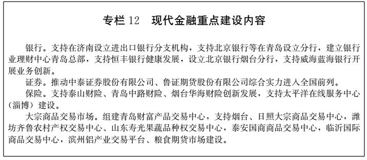 推動金融業(yè)務(wù)創(chuàng)新。加快完善金融市場、金融組織、金融產(chǎn)品和服務(wù)模式,更好滿足實體經(jīng)濟(jì)和人民群眾多樣化的金融需求。鼓勵利用互聯(lián)網(wǎng)、大數(shù)據(jù)、人工智能等,進(jìn)行金融業(yè)務(wù)流程改造和產(chǎn)品創(chuàng)新。積極發(fā)展養(yǎng)老金融、教育金融、文化金融、旅游金融、農(nóng)村金融等新型金融服務(wù)。規(guī)范發(fā)展互聯(lián)網(wǎng)金融、區(qū)塊鏈、人工智能等領(lǐng)域的新型金融業(yè)態(tài)。支持小額貸款公司、典當(dāng)、融資租賃、商業(yè)保理等金融組織創(chuàng)新、可持續(xù)發(fā)展。統(tǒng)籌發(fā)展介于現(xiàn)貨與期貨之間的大宗商品交易業(yè)務(wù),打造具有全國影響力的交易場所。支持濟(jì)南推進(jìn)新舊動能轉(zhuǎn)換金融創(chuàng)新發(fā)展試點,開展金融服務(wù)實體經(jīng)濟(jì)改革創(chuàng)新。支持煙臺開展基金管理服務(wù)專項改革創(chuàng)新,青島建設(shè)財富管理金融綜合改革試驗區(qū)。支持棗莊、臨沂等市開展普惠金融改革創(chuàng)新,探索完善區(qū)域普惠金融服務(wù)體系。支持濰坊建設(shè)文化藝術(shù)金融綜合試驗區(qū)、德州舉辦京津冀魯資本技術(shù)交易大會。