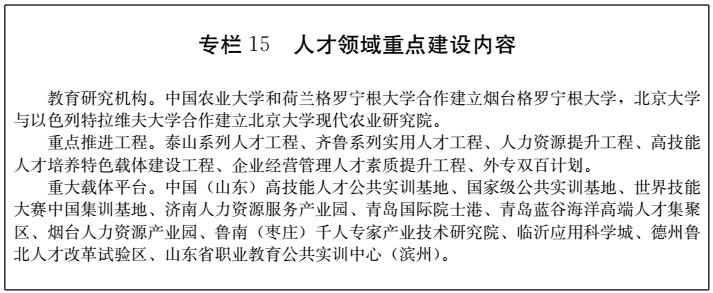 完善人才培養(yǎng)機(jī)制。積極推進(jìn)世界一流大學(xué)和一流學(xué)科建設(shè),爭取國家支持建設(shè)中國康復(fù)大學(xué)、中國能源大學(xué),加快齊魯工業(yè)大學(xué)、齊魯醫(yī)科大學(xué)建設(shè)。實施新工科優(yōu)先發(fā)展計劃,增設(shè)面向新經(jīng)濟(jì)、新產(chǎn)業(yè)的學(xué)科專業(yè),建設(shè)新型高端智庫,造就一大批戰(zhàn)略科技人才、科技領(lǐng)軍人才、青年科技人才和高水平創(chuàng)新團(tuán)隊。鼓勵本科高校、職業(yè)院校(含技工院校)和培訓(xùn)機(jī)構(gòu)開展技術(shù)技能培訓(xùn)、創(chuàng)業(yè)創(chuàng)新培訓(xùn),建設(shè)職業(yè)教育創(chuàng)新發(fā)展試驗區(qū),籌建山東創(chuàng)業(yè)大學(xué)。傳承弘揚(yáng)勞模精神、工匠精神,打造知識型、技能型、創(chuàng)新型勞動者大軍。大力倡導(dǎo)企業(yè)家精神,依法保護(hù)企業(yè)家的創(chuàng)新收益和財產(chǎn)權(quán),培養(yǎng)造就具有戰(zhàn)略思維、國際視野和勇于創(chuàng)新的企業(yè)家和經(jīng)營管理人才隊伍。
