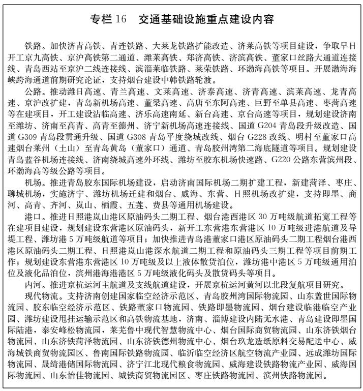 交通基礎(chǔ)設(shè)施。積極融入國家綜合交通網(wǎng),暢通省內(nèi)外運(yùn)輸網(wǎng)絡(luò),打造交通強(qiáng)國戰(zhàn)略山東示范區(qū)。鐵路。加快魯南高鐵、濟(jì)萊臨高鐵建設(shè),打造“三環(huán)四橫六縱”的快速鐵路網(wǎng)絡(luò),建設(shè)大萊龍擴(kuò)能改造、聊泰、淄東等鐵路項目,完善“四縱四橫”貨運(yùn)鐵路網(wǎng)。公路。實施濟(jì)青、京滬(山東段)、沈海(山東段)等大運(yùn)量路段改擴(kuò)建工程,推進(jìn)普通國省道低標(biāo)準(zhǔn)路段改造,按照一條綜合運(yùn)輸通道至少配置一條免費(fèi)快速干線公路的原則,開展全省干線快速路網(wǎng)工程規(guī)劃建設(shè),大力推進(jìn)“四好農(nóng)村路”建設(shè)。軌道交通。推進(jìn)濟(jì)南、青島地鐵和輕軌建設(shè),規(guī)劃建設(shè)淄博、煙臺、濰坊、濟(jì)寧、臨沂、威海等市軌道交通。機(jī)場。加強(qiáng)民用運(yùn)輸機(jī)場和通用機(jī)場建設(shè),完善機(jī)場布局,提高機(jī)場資源配置效率,構(gòu)建現(xiàn)代民用航空體系。港口。以資本為紐帶、以市場為導(dǎo)向,整合港口資源,帶動航運(yùn)協(xié)同合作及一體化運(yùn)營,打造現(xiàn)代化港口群。按程序成立省港口發(fā)展管理委員會,作為省政府議事協(xié)調(diào)機(jī)構(gòu),對港口群進(jìn)行統(tǒng)一規(guī)劃,實現(xiàn)港口間合理分工和良性互動。支持各市通過多種方式參與港口運(yùn)營,打通出海通道。加快港口公用基礎(chǔ)設(shè)施及大型化、專業(yè)化碼頭建設(shè),推進(jìn)港口內(nèi)部優(yōu)化整合,打造新一代國際智慧港口。實施通江達(dá)海內(nèi)河水運(yùn)工程,加強(qiáng)內(nèi)河航道建設(shè),初步形成以京杭運(yùn)河主航道為骨架,其他支流航道為補(bǔ)充的“一干多支”航運(yùn)網(wǎng)絡(luò)和濟(jì)寧港、棗莊港、泰安港等內(nèi)河港口群。支持濟(jì)南優(yōu)化跨黃河橋隧布局。交通與物流融合發(fā)展。發(fā)展智慧物流,鼓勵有實力的運(yùn)輸企業(yè)向多式聯(lián)運(yùn)、綜合物流服務(wù)商轉(zhuǎn)變,推進(jìn)國際貨運(yùn)班列運(yùn)行,打通省內(nèi)外物流大通道,建設(shè)綜合性物流基地和節(jié)點樞紐城市。開展國際中轉(zhuǎn)集拼業(yè)務(wù)和大宗商品國際中轉(zhuǎn)創(chuàng)新試點,支持有條件的市建設(shè)國家物流標(biāo)準(zhǔn)化城市試點和現(xiàn)代物流創(chuàng)新發(fā)展城市試點,發(fā)揮青島膠州灣國際物流園等國家示范物流園區(qū)的引領(lǐng)帶動作用,提高物流信息化、標(biāo)準(zhǔn)化和集約化水平。