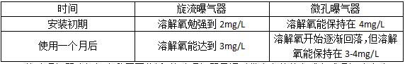 在溶解氧方面,在改造項目的使用初期,微孔曝氣器氧溶解氧更高,旋流曝氣器的溶解氧會隨著時間的延伸而升高直至穩(wěn)定。