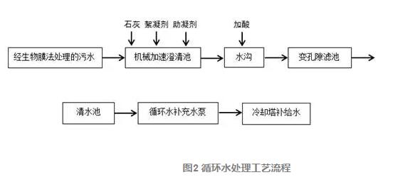 輔機(jī)冷卻用水不經(jīng)過化學(xué)水處理系統(tǒng),城市中水中主要含有少量懸浮物、COD、BOD、顏色、臭味、膠體、營養(yǎng)鹽(磷、氮)等,由于侯馬水質(zhì)中暫硬和堿度較高,為降低中水中暫硬和堿度,并進(jìn)一步去除城市中水中的COD、BOD、顏色、臭味、膠體、營養(yǎng)鹽(磷、氮)等雜質(zhì),本公司將城市中水采用石灰處理+變孔隙濾池深度處理工藝,以達(dá)到循環(huán)冷卻水系統(tǒng)的補(bǔ)給水水質(zhì)要求。工藝流程見下圖。