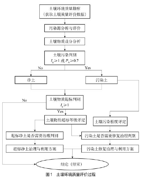由圖1可知,土壤環(huán)境質(zhì)量評價包括土壤污染評價和土壤物質(zhì)符合環(huán)境質(zhì)量要求的評價兩部分內(nèi)容。其中,土壤污染評價主要包括土壤污染與否判別、土壤中致污物質(zhì)是否超標(biāo)判別與土壤污染程度評價。實(shí)施土壤環(huán)境質(zhì)量評價時,首先應(yīng)判別某土壤是否受到了某物質(zhì)的污染,即確定該土壤是污染土還是凈土。然后,對于凈土,應(yīng)進(jìn)一步判別某物質(zhì)成分是否符合土壤質(zhì)量標(biāo)準(zhǔn)要求,如果符合土壤環(huán)境如果不符合土壤環(huán)境質(zhì)量要求,應(yīng)進(jìn)一步研究土壤的利用或治理方法。對于污染土,應(yīng)首先判別致污物質(zhì)含量是否符合土壤環(huán)境質(zhì)量要求,如果致污物質(zhì)含量符合土壤環(huán)境質(zhì)量要求,給出結(jié)論并結(jié)束評價;如果致污物質(zhì)含量不符合土壤環(huán)境質(zhì)量要求,應(yīng)結(jié)合土壤污染程度評價結(jié)果,進(jìn)一步研究污染土利用、修復(fù)或治理方案。