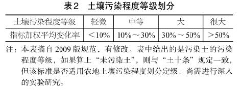 (4)土壤污染程度等級劃分。土壤污染程度是指侵入土壤的致污物質(zhì)對土壤成分及土體結(jié)構(gòu)和性質(zhì)的綜合影響程度,不僅指土壤成分和結(jié)構(gòu)的變化程度,還包括土體強(qiáng)度、變形、滲透、腐蝕、吸附、酸堿度、氧化還原、生物養(yǎng)分、毒性等的變化程度,具體視土壤污染程度評價的目的而定,對于農(nóng)地土壤,宜側(cè)重于土壤化學(xué)成分評價;對建設(shè)用地,宜側(cè)重于土體強(qiáng)度、變形等力學(xué)性質(zhì)評價。確定土壤污染程度時,應(yīng)首先分別計(jì)算出每種致污物質(zhì)所引起的土壤成分、結(jié)構(gòu)和各種性質(zhì)指標(biāo)變化的變化率(污染前后指標(biāo)的差值與污染前指標(biāo)值之百分比)。然后,分別計(jì)算各指標(biāo)變化率的平均值。然后,再計(jì)算各指標(biāo)平均變化率的加權(quán)平均值。最后,依據(jù)加權(quán)平均變化率按表2確定土壤污染程度等級。