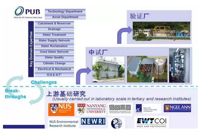 而如何將重大工程和科研投入,實(shí)實(shí)在在地轉(zhuǎn)為產(chǎn)業(yè)推動(dòng)力,新加坡的實(shí)證研發(fā)和示范研發(fā)機(jī)制功不可沒。水處理技術(shù)從實(shí)驗(yàn)室到中試再到生產(chǎn)規(guī)模使用,須經(jīng)歷一個(gè)長(zhǎng)期過程,而新技術(shù)的應(yīng)用,獲得業(yè)主的信任和試用的成本也很高,這也是水處理技術(shù)推廣難和推廣慢的問題所在。