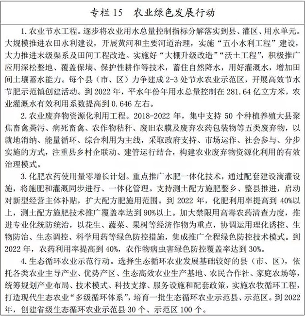 (二)推進(jìn)農(nóng)業(yè)清潔生產(chǎn)。實(shí)施化肥、農(nóng)藥減量增效行動(dòng),全面推廣測土配方施肥技術(shù),強(qiáng)化化肥、農(nóng)藥、獸藥、飼料添加劑等投入品使用管理,推進(jìn)病蟲害統(tǒng)防統(tǒng)治和綠色防控。大力實(shí)施種養(yǎng)業(yè)循環(huán)一體化工程,加快規(guī)?;笄蒺B(yǎng)殖場區(qū)糞污處理設(shè)施建設(shè)與標(biāo)準(zhǔn)化改造,推動(dòng)規(guī)模化大型沼氣建設(shè),散養(yǎng)密集區(qū)逐步實(shí)現(xiàn)畜禽糞便污水分戶收集、集中處理利用,開展有機(jī)肥替代化肥試點(diǎn)。到2022年全省畜禽糞污綜合利用率達(dá)到81%,規(guī)模養(yǎng)殖場糞污處理設(shè)施裝備配套率達(dá)到100%。以縣為單位推進(jìn)農(nóng)業(yè)廢棄物資源化利用試點(diǎn),推廣秸稈高效利用模式,到2022年全省主要農(nóng)作物秸稈綜合利用率達(dá)到92%。推進(jìn)廢舊地膜、微灌材料和包裝廢棄物等回收處理,開展地膜使用全回收、機(jī)械化免膜生產(chǎn)、消除土壤殘留等試點(diǎn)。創(chuàng)建一批國家農(nóng)業(yè)可持續(xù)發(fā)展試驗(yàn)示范區(qū)。