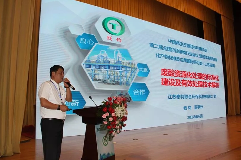 江蘇泰特聯(lián)合環(huán)??萍加邢薰径麻L錢鈞以“廢酸資源化處理的標(biāo)準(zhǔn)化建設(shè)及有效處理技術(shù)解析”為主題,概述了廢酸資源化處理的緊迫性及標(biāo)準(zhǔn)化建設(shè)發(fā)展方向,梳理出涉及到的相關(guān)政策法規(guī),并分享了泰特公司鋼制品鹽酸酸洗廢液的有效處理技術(shù)。