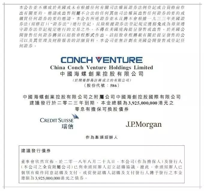 2018年8月30日凌晨,海螺創(chuàng)業(yè)抓住有利的市場(chǎng)機(jī)遇,選擇合適的發(fā)行窗口,成功發(fā)行了5年期39.25億港元零票息可轉(zhuǎn)換債券。