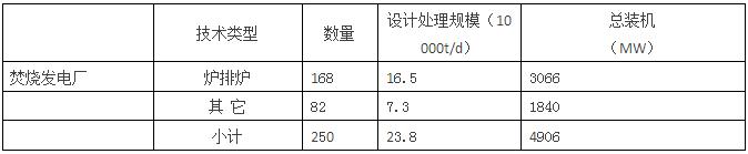 截至2 0 1 6年底,投入運(yùn)行的生活垃圾焚燒發(fā)電廠有250座,總處理能力為23.8萬(wàn)噸/日,總裝機(jī)約為4906MW。其中采用爐排爐的焚燒發(fā)電廠有168座,合計(jì)處理能力達(dá)到16.5萬(wàn)噸/日,裝機(jī)達(dá)到3040MW;其余主要為采用流化床的焚燒發(fā)電廠,總計(jì)有82座,合計(jì)處理能力為7.3萬(wàn)噸/日,裝機(jī)達(dá)到1840MW(見(jiàn)下表)。