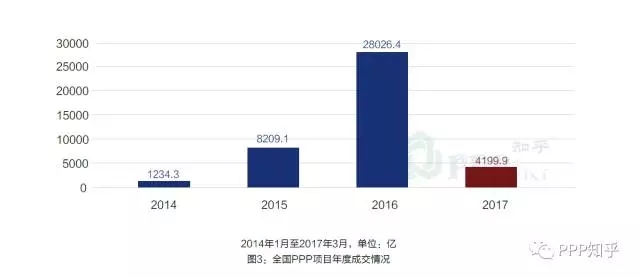 而中國自2014年以來,根據(jù)PPP知乎和龍?jiān)鞒堑氖袌?chǎng)成交月報(bào)數(shù)據(jù),截止2017年3月31日,大約3年的時(shí)間成交項(xiàng)目總數(shù)就達(dá)到了2579個(gè),累計(jì)金額達(dá)到了4.17萬億元,并呈現(xiàn)了明顯的逐年加速態(tài)勢(shì)(參見《2017年3月全國PPP項(xiàng)目市場(chǎng)動(dòng)態(tài)》)。