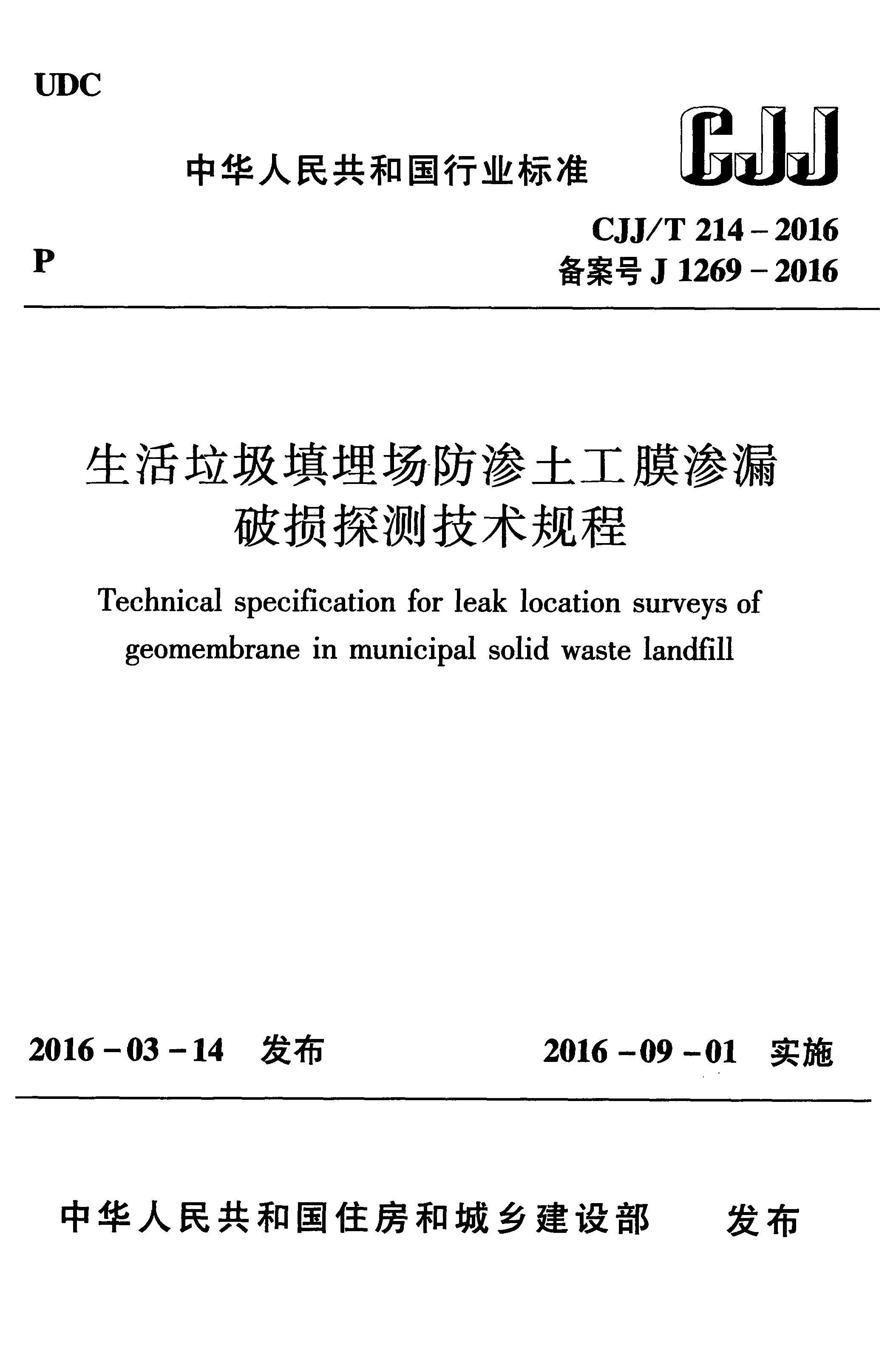 生活垃圾填埋場(chǎng)防滲土工膜滲漏破損探測(cè)技術(shù)規(guī)程(CJJ/T 214-2016)