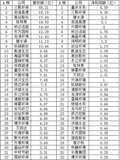 2017年多數(shù)環(huán)保上市企業(yè)一季度報(bào)告顯示贏得開(kāi)門(mén)紅,同期均有所增長(zhǎng),僅四家表示營(yíng)業(yè)收入同期下降。不過(guò)凈利潤(rùn)7家為虧損狀態(tài), 15家同期下降。以下A榜為營(yíng)業(yè)收入排行榜,B榜為凈利潤(rùn)排行榜。C榜為營(yíng)業(yè)收入同比增長(zhǎng)率排行榜,D榜為凈利潤(rùn)同比增長(zhǎng)率排行榜。