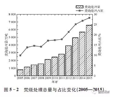 截止到2015年底,我國(含設(shè)市城市與縣城)共建成生活垃圾焚燒設(shè)施257座(其中2015年新建成設(shè)施35座),設(shè)施占比12.4%,總處理能力235224噸/日(其中2015年新建成設(shè)施處理能力34623噸/日),占無害化處理能力的31.0%;年焚燒垃圾6577.0萬噸,占無害化處理總量的28.3%。與2014年相比,在焚燒設(shè)施、焚燒處理能力和焚燒處理量上分別同比增長(zhǎng)15.8%、17.3%和15.9%,在設(shè)施數(shù)量占比、設(shè)施能力占比和處理量占比方面分別增加了1.0、2.4和1.5個(gè)百分點(diǎn)。2005年度至2015年度焚燒設(shè)施規(guī)模與占比變化見圖5-1和圖5-2所示,與“十一五”期間相比,“十二五”區(qū)間,尤其是2012年以后,焚燒處理能力年增長(zhǎng)20%以上。