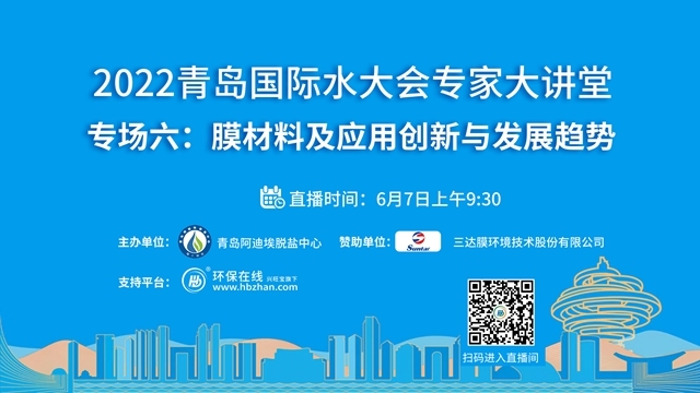 “2022青島國際水大會專家系列大講堂”接力第七場——凈水行業(yè)高端論壇將于6月14日上午登陸環(huán)保在線!緊跟海水淡化、工業(yè)節(jié)水與污水資源化、城鎮(zhèn)水務(wù)、水資源可持續(xù)、水環(huán)境治理、膜材料等議題的熱度,凈水行業(yè)的當下與未來,誠邀業(yè)界同仁共探共論。(點擊圖片,即...
