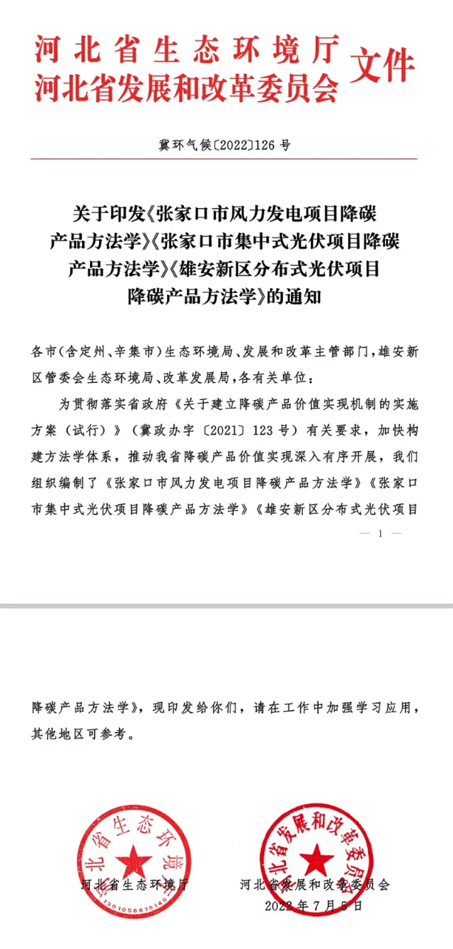 近日,由張家口市生態(tài)環(huán)境局組織編制的《張家口市風(fēng)力發(fā)電項(xiàng)目降碳產(chǎn)品方法學(xué)》和《張家口市集中式光伏項(xiàng)目降碳產(chǎn)品方法學(xué)》,獲河北省生態(tài)環(huán)境廳、河北省發(fā)展改革委聯(lián)合批準(zhǔn)發(fā)布實(shí)施,是2022年河北省首批發(fā)布的降碳產(chǎn)品方法學(xué),也是全國(guó)首個(gè)市級(jí)“綠電”降碳產(chǎn)品方法學(xué)。 今年以來(lái),張家口市...