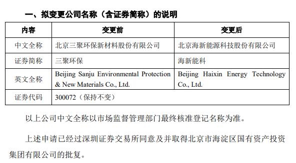 2022年6月29日,北京三聚環(huán)保新材料股份有限公司發(fā)布了《關(guān)于擬變更公司名稱(含證券簡(jiǎn)稱)的公告》。 即,“北京三聚環(huán)保新材料股份有限公司”變更為“北京海新能源科技股份有限公司”,證券簡(jiǎn)稱從“三聚環(huán)保”變更為“海新...
